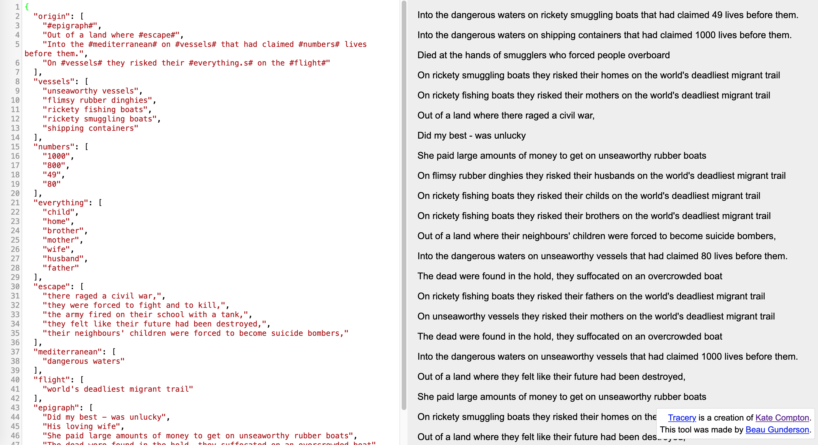 To generate the micro stories in the MIDO's notebook, we used Tracery, a text generator. We collected phrases, facts, and quotes from news articles that were then combined by the program to generate new ways of speaking about the crisis.