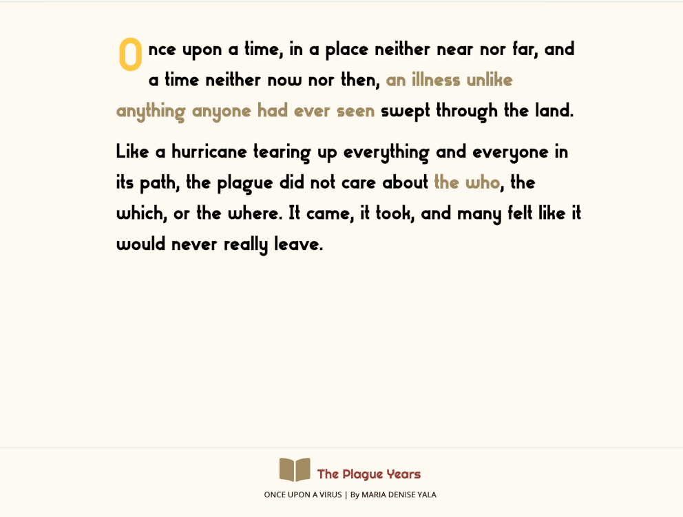 Once Upon a Virus is a hypertext fantasy story that uses fairy tales as a critical device to examine societal attitudes towards disease. This thesis draws on public domain, queer, and feminist storytelling approaches to retell and revision the story of HIV while contributing to a developing definition of what the practice of storytelling is and looks like today.
