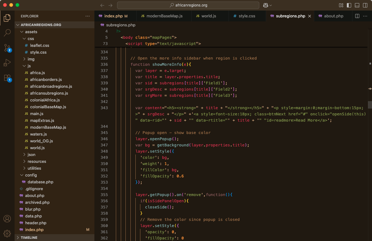 To create the clickable african regions on the interactive Leaflet.js map, I used GeoJSON Feature Collection objects, combining different svg polygons to form the regions as specified by the research project.