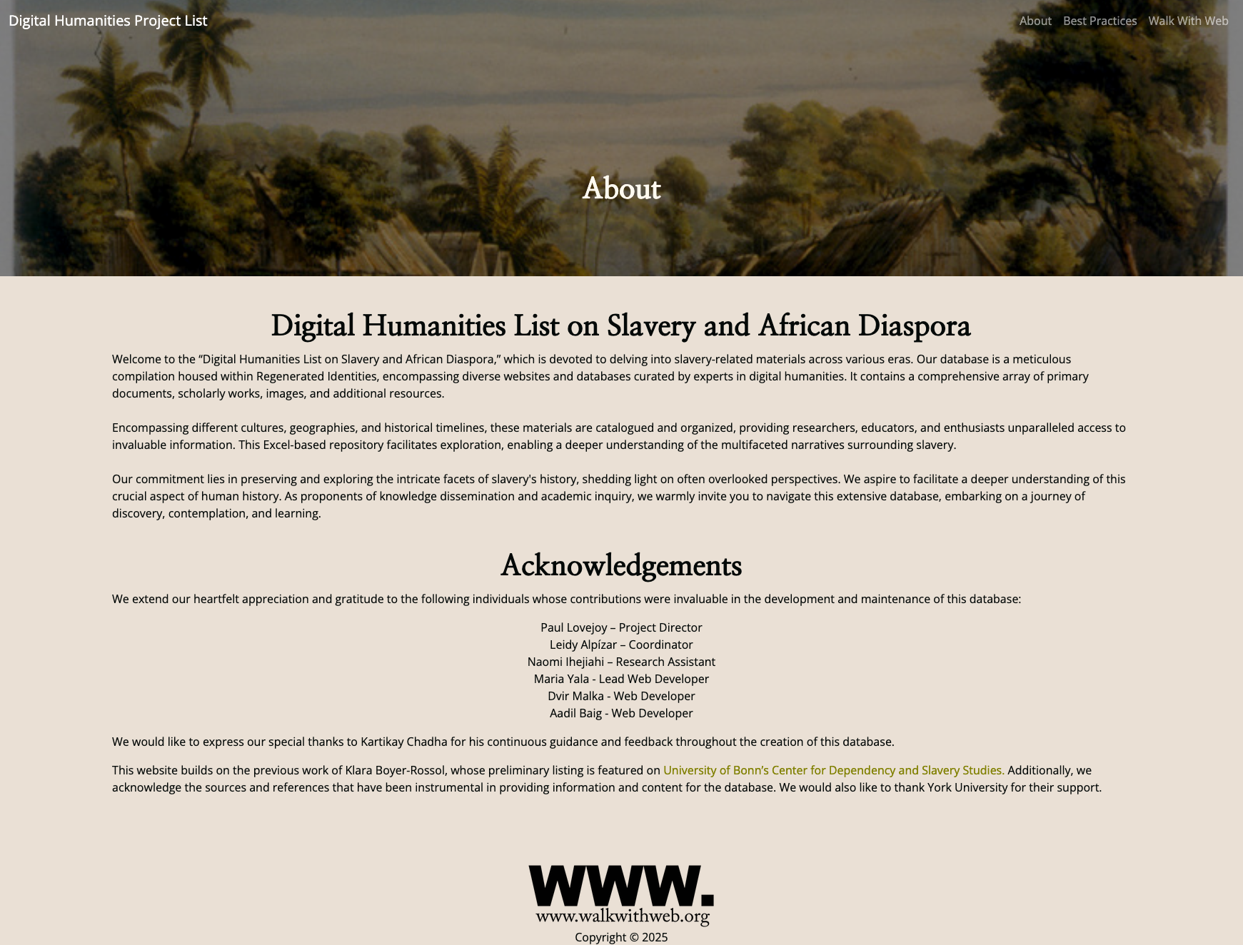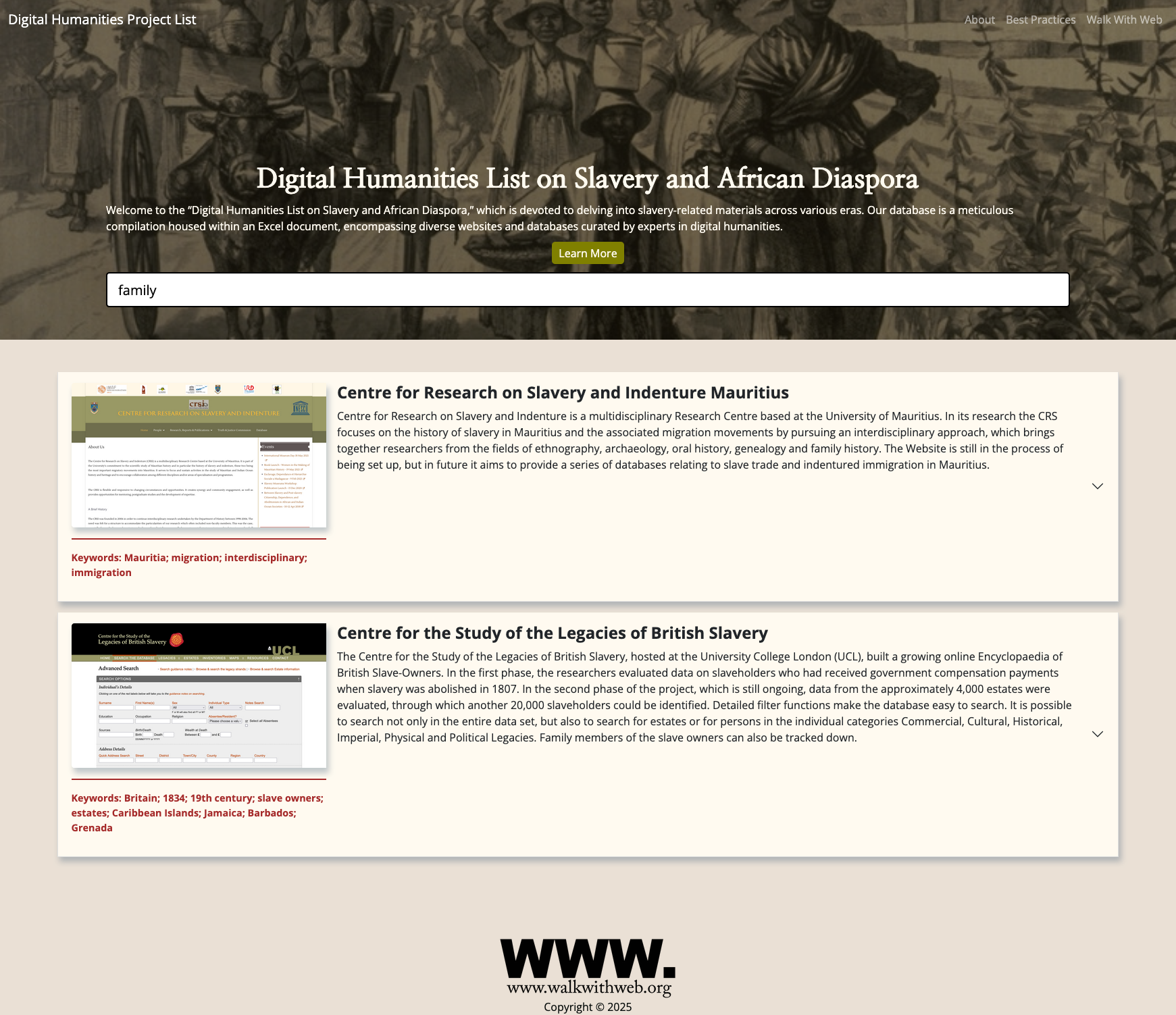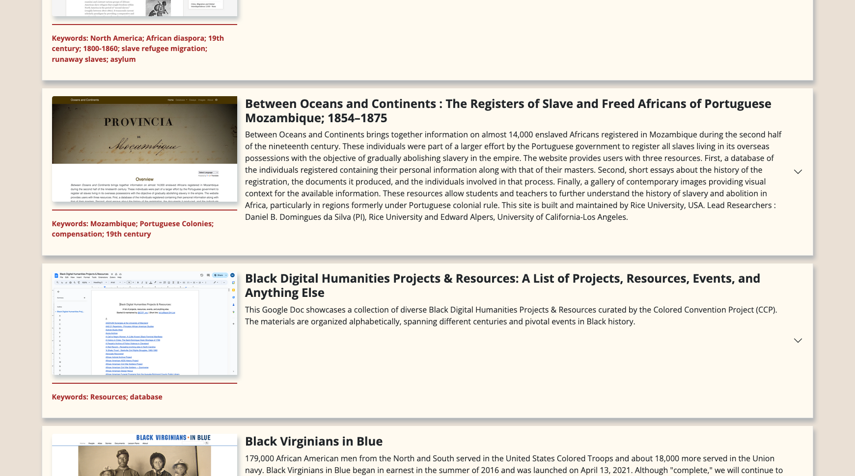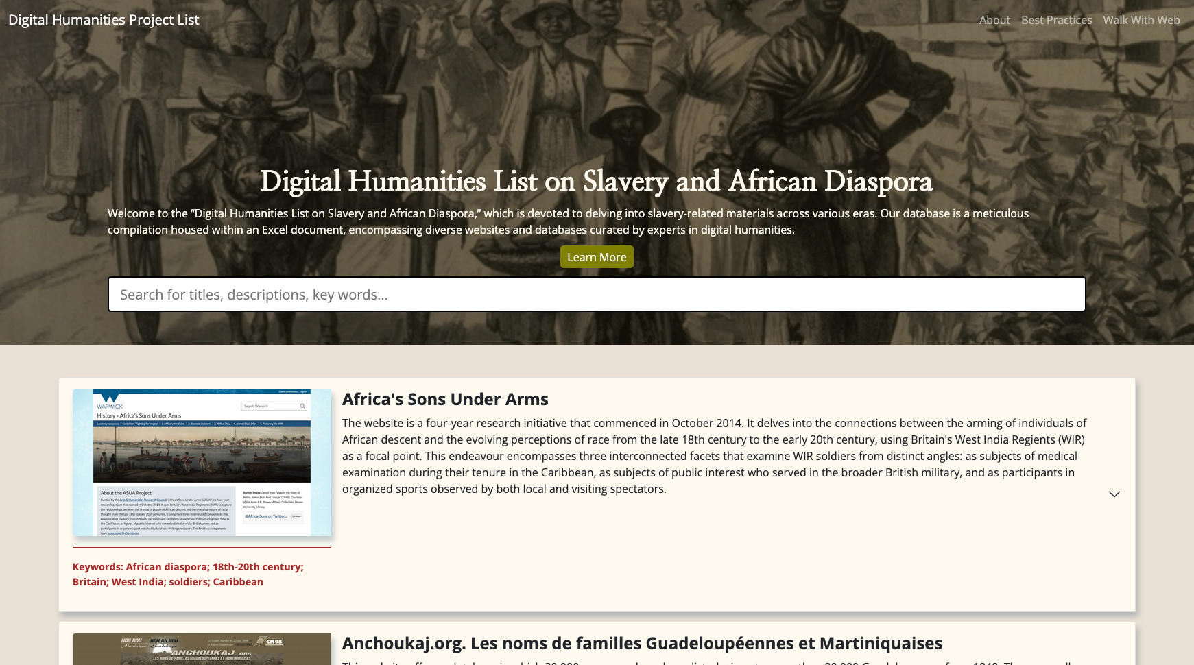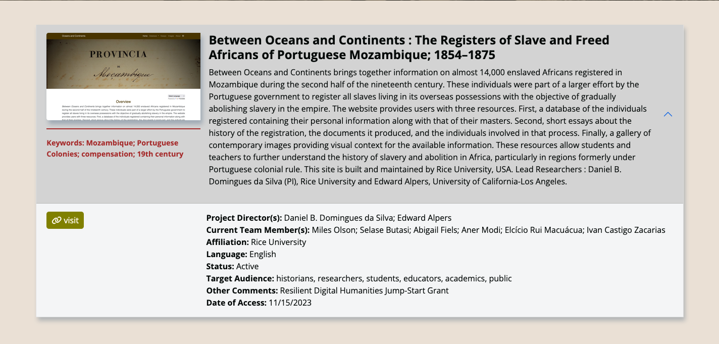 Digital Humanities List on Slavery and African Diaspora is a resource compiling Digital Humanities research projects.