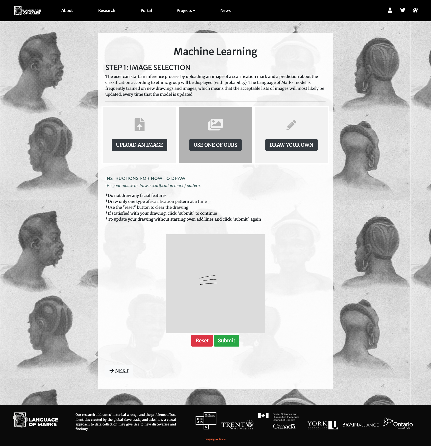 I designed and developed the Machine Learning user flow, incorporating the machine learning model develop by fellow Research Assistant, Youssouf Traore. The Machine Learning flow incorporated features that allowed users to either upload images, pick an image from our gallery, or draw one of their own using the HTML canvas.