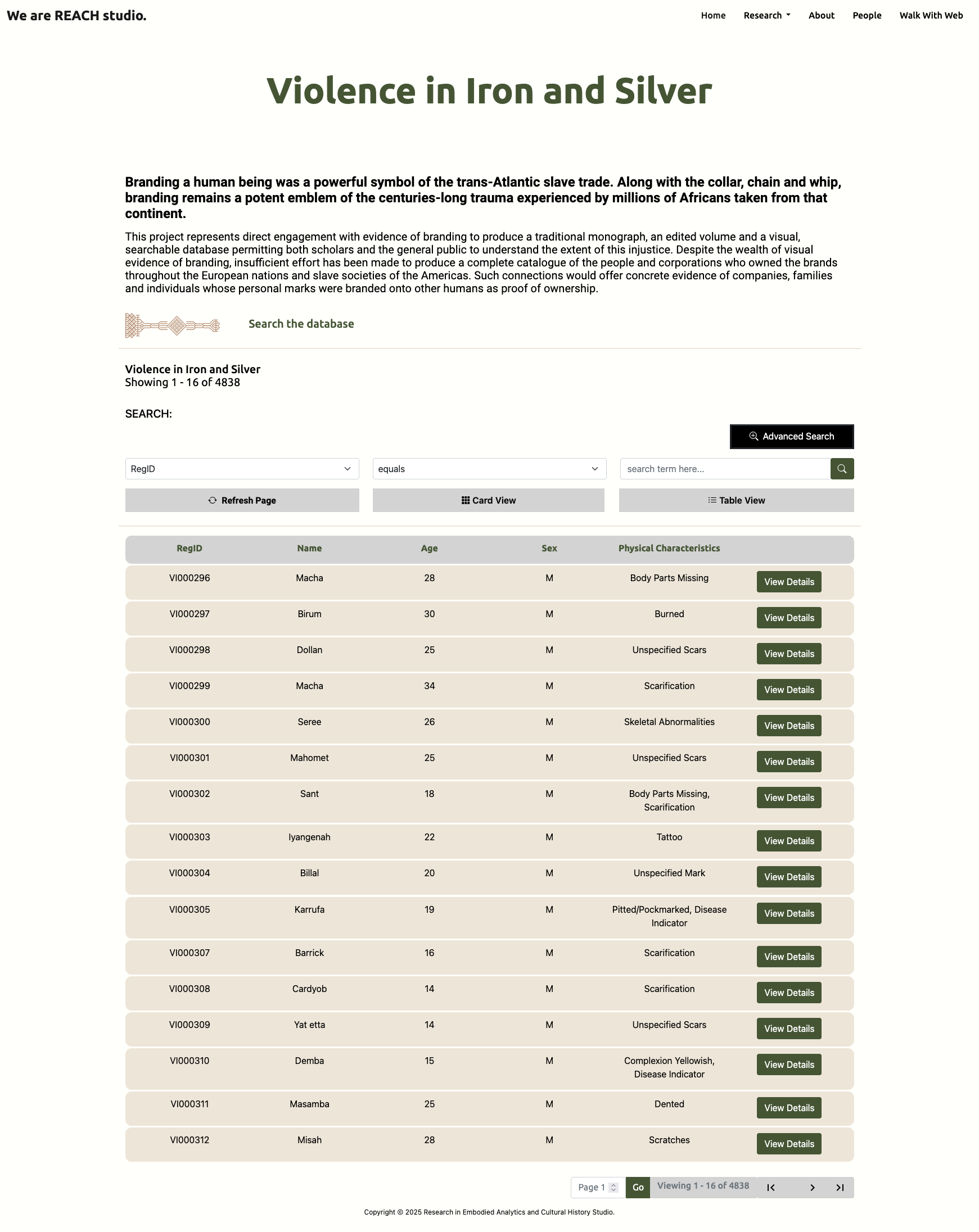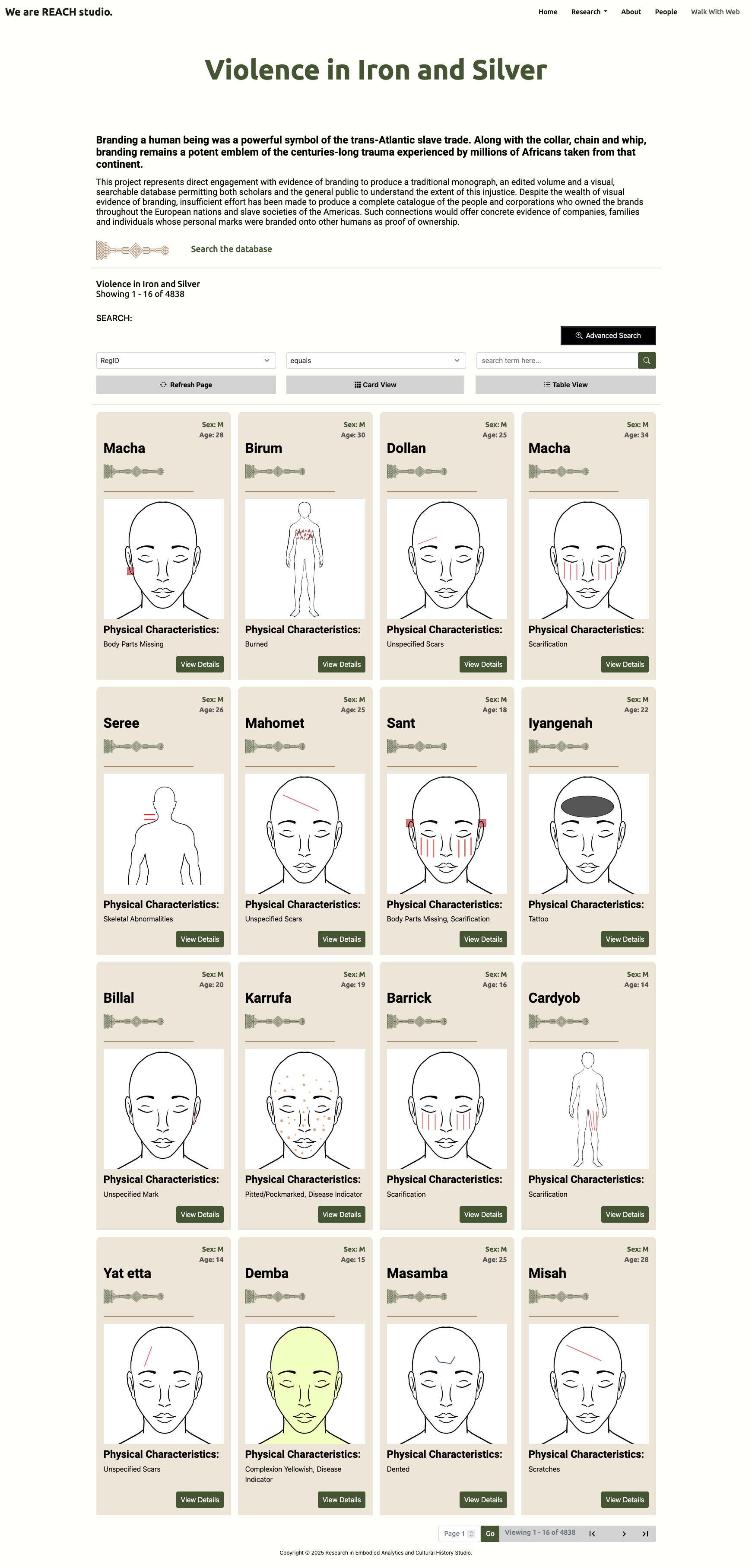 I created a search feature allowing users to query the project's MySQL database. The search criteria is based on the columns of the database and the search uses Ajax JavaScript and PHP to fetch and display results. Results are presented either in a card or table view.