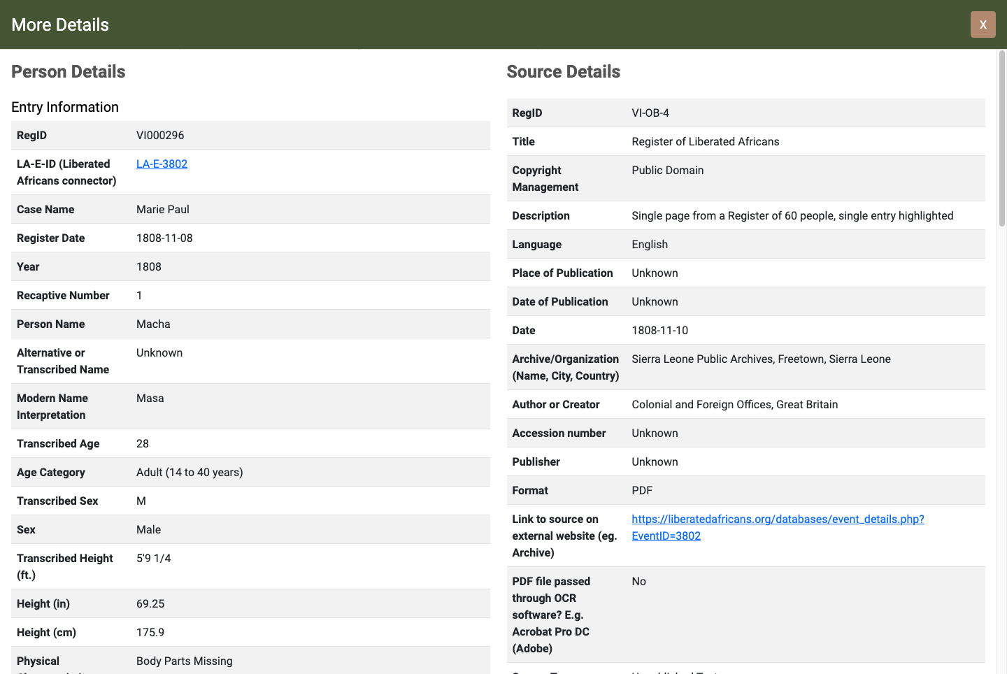 When the "view details" button is clicked, the data record's metadata is presented in an overlay window.