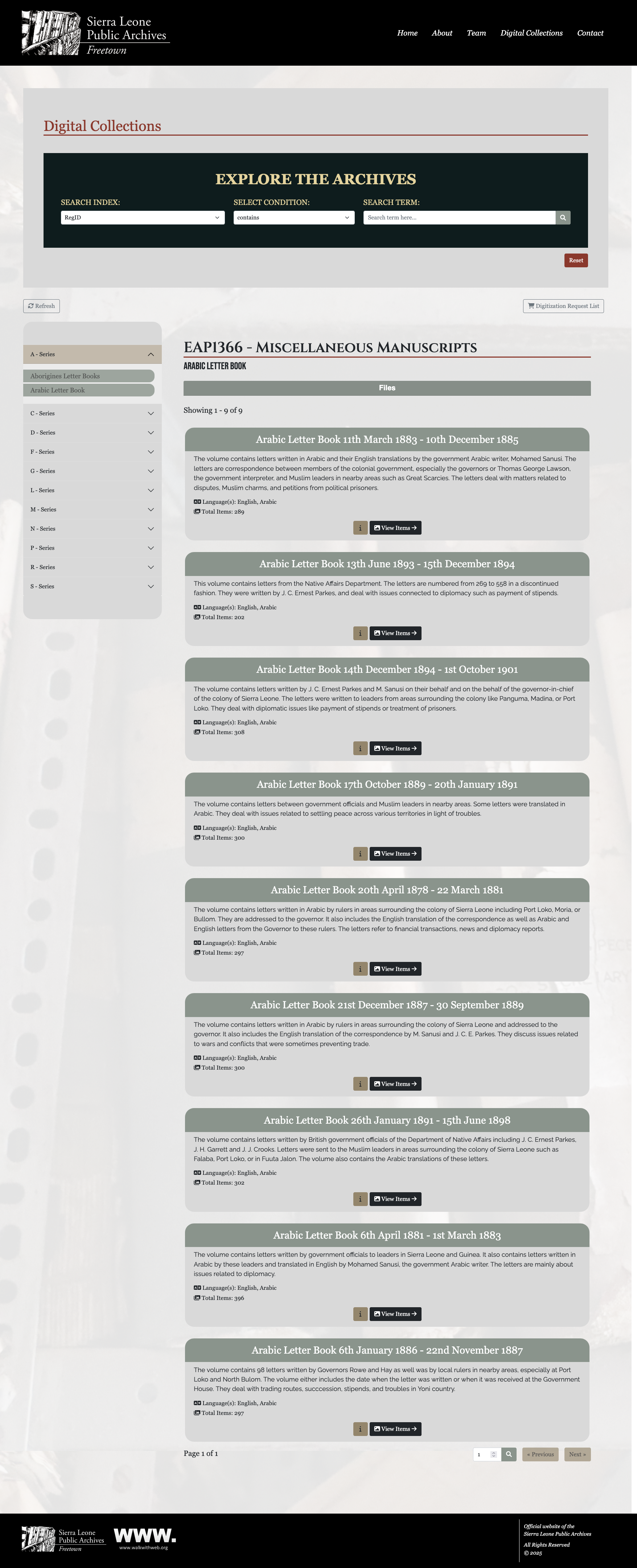 In my role as Senior Developer, in addition to designing the site I was also tasked with managing the database of over 82,000 images. I also worked on organizing the digitized images and preparing them for archiving on the Endangered Archives Programme ran by the British Library. The collection EAP 1366 is currently live on the British Library website.